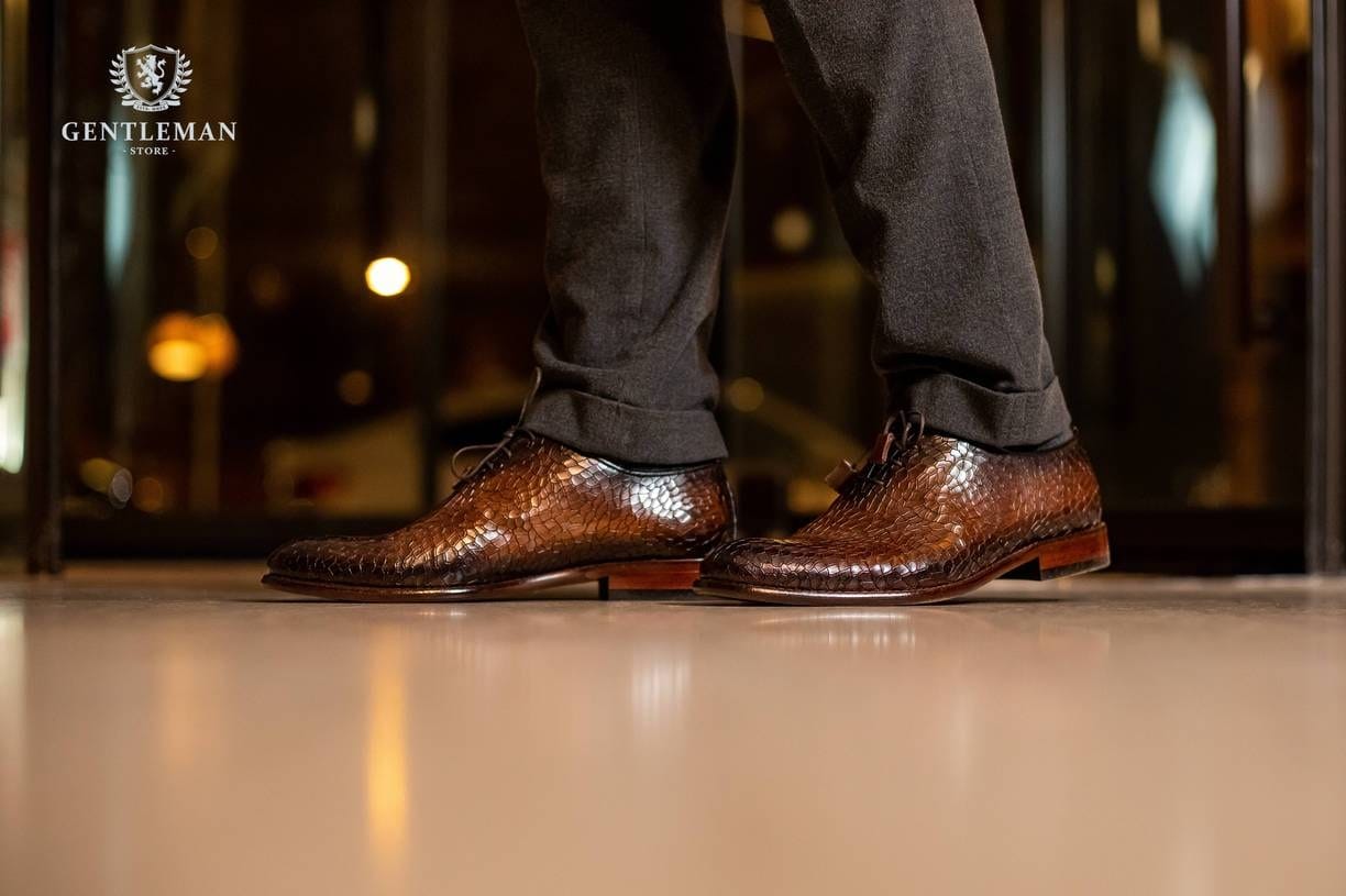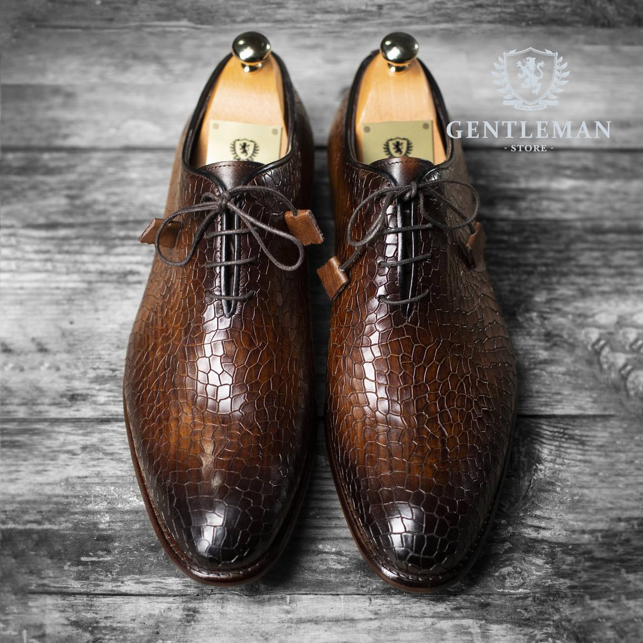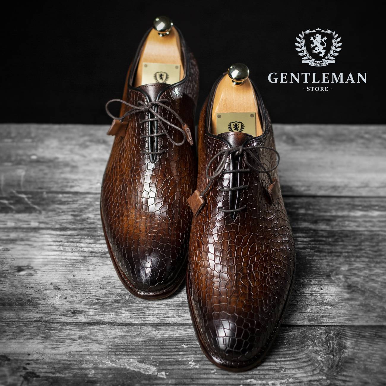 Luksuzne smeđe, kožne cipele sa kroko teksturom i blago zatamnjenom krajnjom linijom cipele. Ručna izrada brenda Gentleman Shoes.