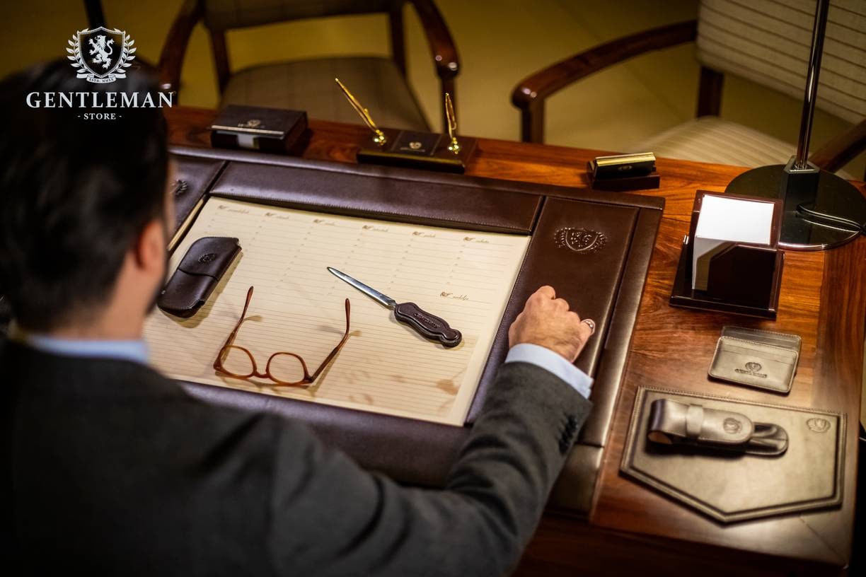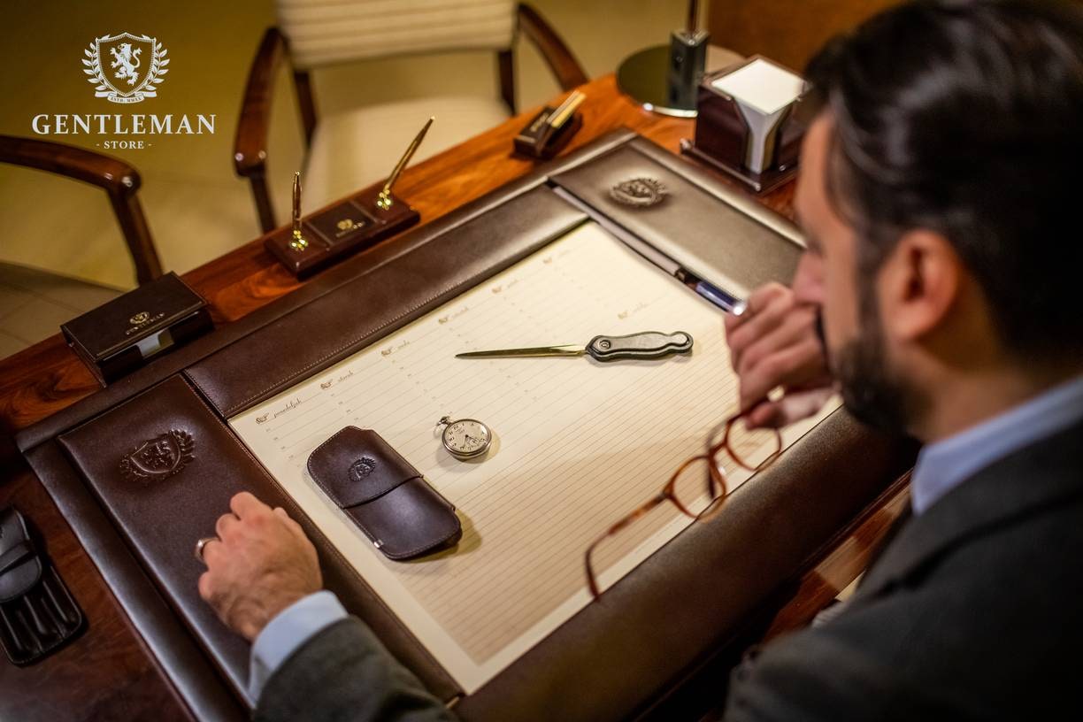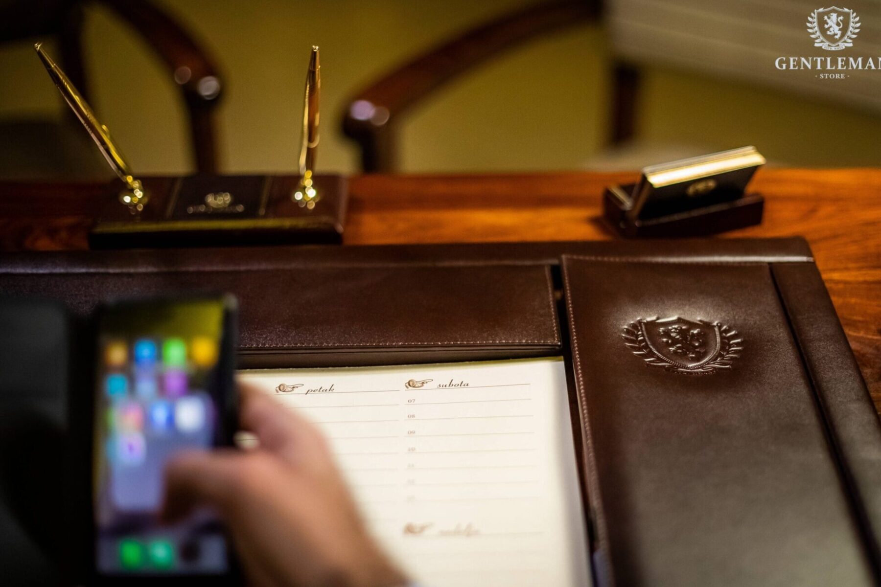 Kožna stona mapa upakovana je u luksuznu tkanu zaštitnu torbu, a na sam artikal, utisnut je logo našeg brenda “Gentleman”.