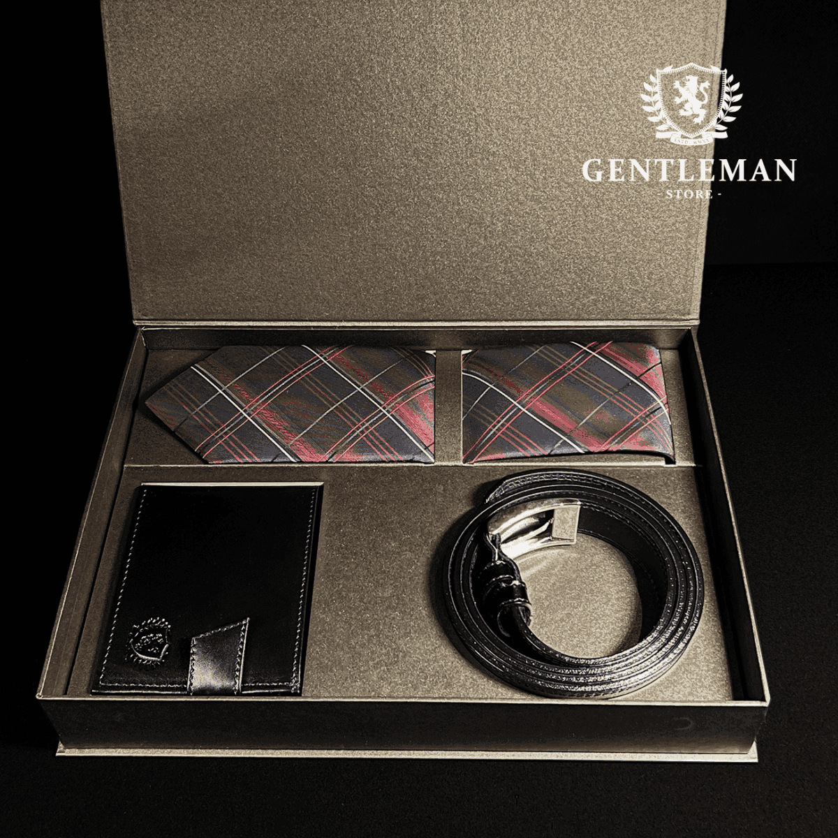Ovaj poklon set sadrži tri artikla, kaiš, kravata i novčanik ručno izrađeni od visokokvalitetne goveđe kože, upakovano u luksuznu ambalažu.