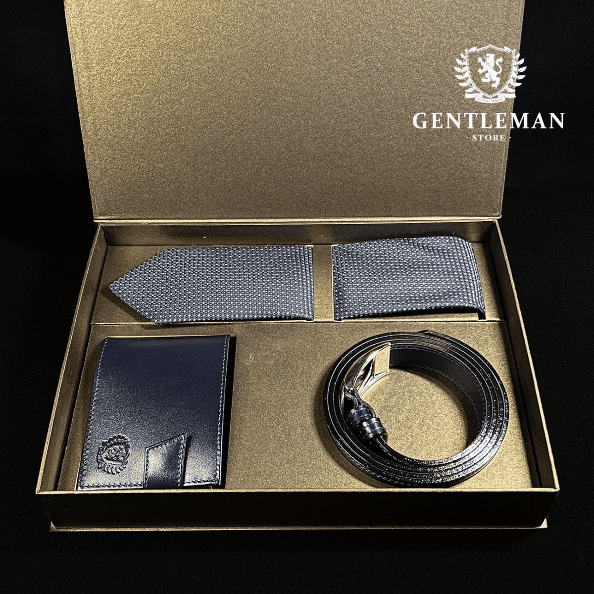 Ovaj poklon set sadrži tri artikla, kaiš, kravata i novčanik ručno izrađeni od visokokvalitetne goveđe kože, upakovano u luksuznu ambalažu.