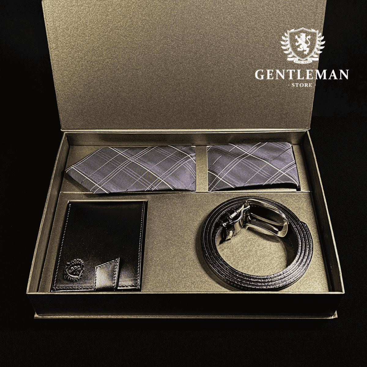 Ovaj poklon set sadrži tri artikla, kaiš, kravata i novčanik ručno izrađeni od visokokvalitetne goveđe kože, upakovano u luksuznu ambalažu.